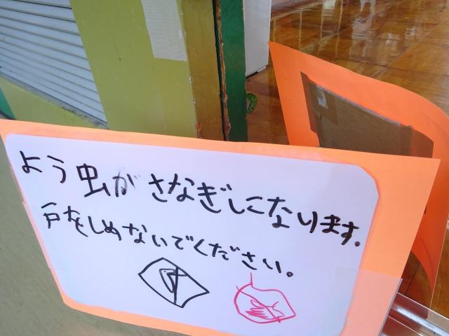 あじさい学級で飼育していたアゲハチョウの幼虫がさなぎになりました。ところが、飼育していたケースから幼虫が抜け出し、教室のドアでさなぎになったのです。通りがかりに誰かが触ってしまったり、ドアを閉めてしまったりしないように、さっそく注意喚起のポスターを作りました。 無事にチョウに育ってね!