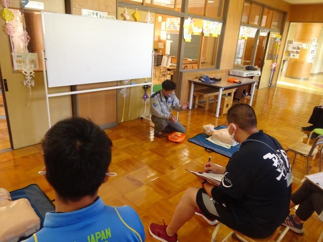 津端消防署の方から、胸骨圧迫の方法やAEDの使用方法等を、実技を中心に学びました。講習会は毎年行われていますが、命を守るための学習ですから職員は真剣そのものです。万が一に備えての大切な講習会でしたが、事故なく安全に水泳学習が進むことを祈っています。