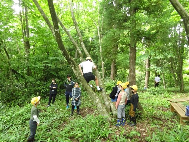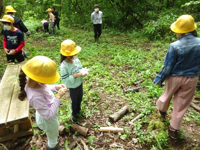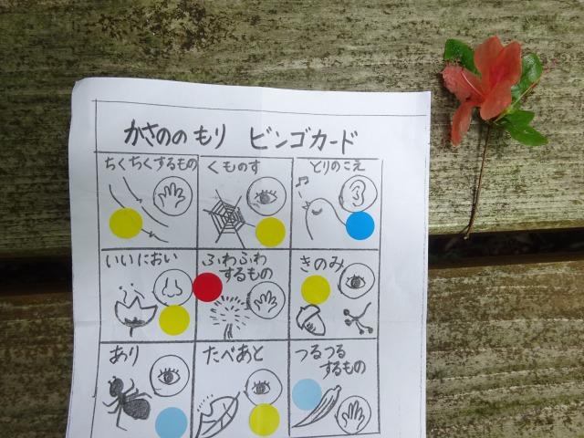 今日は「かさののもりビンゴ」に挑戦です。五感を働かせて、森の中から自然のものを見つけます。「こんな時期に木の実はあるの?」と思いましたが、去年落ちた木の実が足元にたくさんありました。そのことを子どもたちはちゃんと知っていました。また、「いいにおい」とは言っても、ある子は花の匂いを、ある子は木の匂いを、またある子は森自体が「いいにおい」と言いました。「なるほど」と思いました。カードの9つの枠はすぐにクリアし、その後はそれぞれに自然を満喫していました。