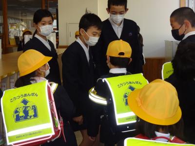 児童玄関では,6年生が,登校した1年生を出迎え,教室へ送ってくれています。