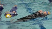説明の後,岡野定氏はスーツを着て入水・・・・・・ 見事にプカプカ