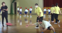 町のスポーツ推進委員さんの説明の後,親子で練習をしました。