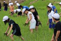 6月25日,5年生が田んぼの除草作業を行いました。今年も今井農場さんの水田をお借りして,稲を育てる学習を行っています。田植えは感染症予防の為行えませんでしたが,少し落ち着いてきたので,稲の成長の観察を兼ねて,田んぼの除草作業と生き物調査を行いました。初めて入る田んぼに戸惑う子も多かったですが,すぐに慣れて稲の間の草を抜いていきました。今井さんからは,おいしくて安全なお米を作るために行っていることや,稲の成長などについて詳しく教えていただきました。今後何回か成長を観察し,秋には稲刈りを行う予定です!