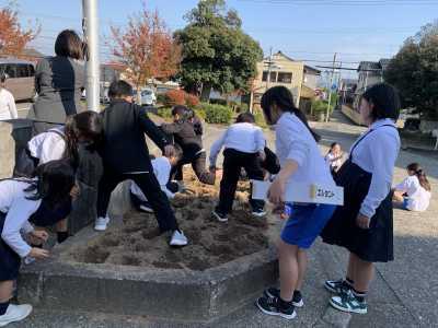 13日の昼休みに、環境委員会と1・2年生がいっしょに協力して球根を植えました。春に咲くのが楽しみですねハート