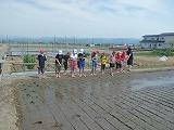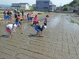 5月6日(金)に5年生が総合的な学習の時間に田植え体験をしました。下口さんから田植えの仕方について丁寧に教わり、苗を植えていきました。はだしで田んぼの中に入るのは初めてだったようで、貴重な体験に感謝して楽しみながら活動していました。