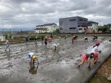 少し肌寒かったのですが、子どもたちは元気いっぱいで、歓声を上げて田植え体験を楽しんでいました。今年はいつも以上に広い範囲の田植えを子どもたちの手で行うことができました。中には、しりもちをついて泥んこになってしまった子もいましたが、みんなはりきって頑張っていました。