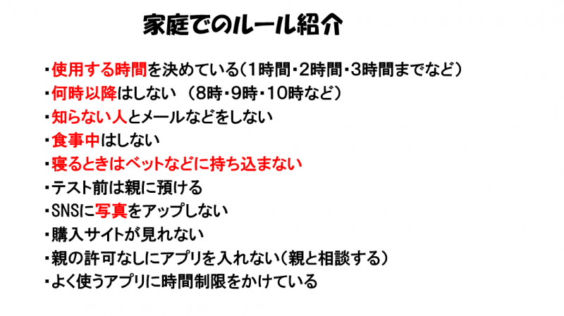 また、PTA家庭教育委員長の園部副会長さんを中心に、保護者にも事前アンケート調査を行いました。保護者の立場で『メディアの利用について親が心配していることをわかって欲しい』という子どもたちへの願いも紹介されました。生徒・保護者両面からの報告となり、例年以上に内容の濃いものになりました。