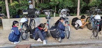 交通安全の 3 つの団体から市内の中学 1 年生に、ヘルメットと自転車のスポークにつける反射材を頂きました。反射材は自動車の運転者に自転車の存在を知らせることができます。命を守るため、さっそく放課後に自転車やヘルメットに装着しました。