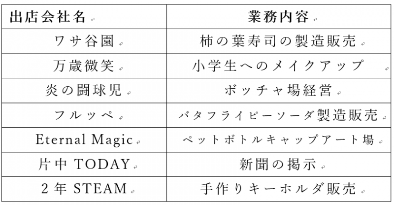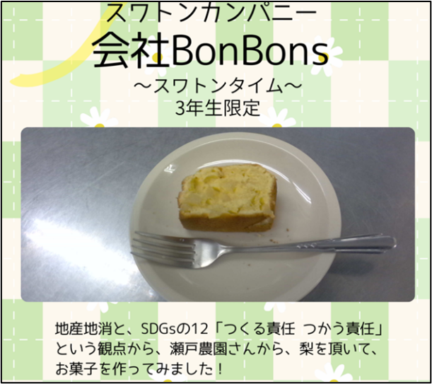 今年のスワトンカンパニーを紹介します。1年生8人が起業したBonBons」というカフェです。残念ながら今年は一社だけとなりましたが、梨のパウ