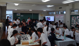 片中学校運営協議会(CS)主催で「すわとん校内カフェ」が開かれました。中学生と地域の住民が気軽に話したり、相談したりできる場を設けようという企画です。地域の皆さんからの手作りおはぎや飲み物が振舞われ90名の生徒が交流を深めることができました。