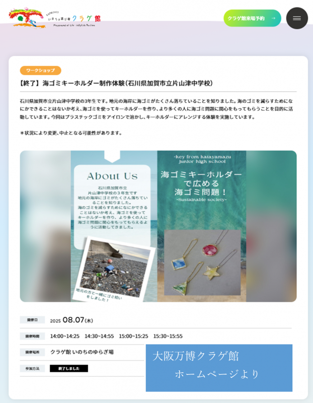 2年時の総合的な学習の時間に、「海ゴミを再利用したキーホルダーで海ゴミ問題を広げる活動」に取り組んできたグループが、昨年のSTEAM発表会で認められ、大阪万博クラゲ館に特設ワークショップブースを構えました。ワークショップでは、海ゴミキーホルダーの制作体験を実施し、長蛇の列ができる程の大成功を収めました。
