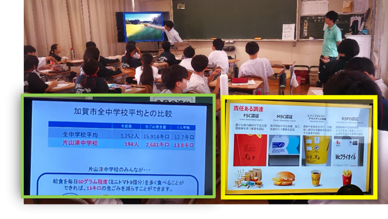 地元の企業の方をお呼びしてお話していただきました。各企業のSDGSの取組を中心に1時間を2回に分けて説明していただきました。協力していただいた企業は、岸グリーンさん・なっぱ会(資源エコロジーリサイクル事業協同組合)さん・貴久(日本マクドナルドフランチャイジー)さんの3社の皆さんです。貴重なお話ありがとうございました。