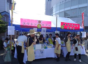 今年のスワトンカンパニー「カフェ『BonBons』が南陽園さんのふれあいボランティアカーニバルに出店しました。保健所さんからの指導もあり朝早くから梨のパウンドケーキを焼き上げ80セット用意しました。朝10時の発売開始からなんと約1時間で完売という超人気店となりました。売り子として生徒会執行部を中心に3年生も大活躍してくれました。「あきづき」を提供して下さった瀬戸梨園さんにも感謝申し上げます。