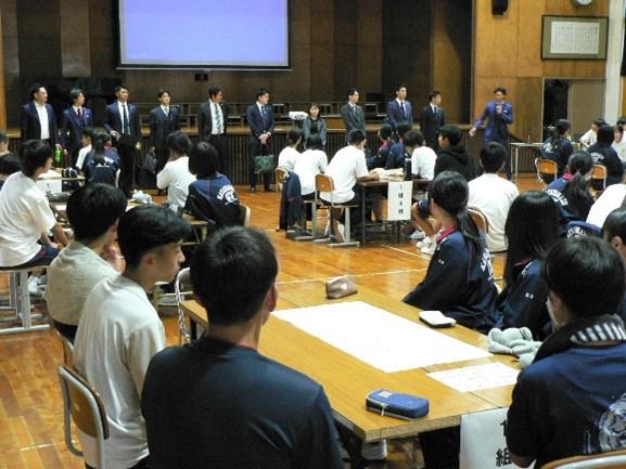 新人大会歓迎会の後、青団・赤団に分かれての結団式が行われました。10月2日(木)に開催予定の体育祭に向けて、1年2年3年各団の初顔合わせとなりました。団長等役員の紹介・挨拶、完成した団旗に込めた思い等を3年生から下級生に伝えていました。保護者の皆さん、是非子どもたちの頑張りを応援して下さい。