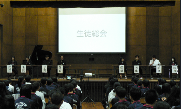 生徒会主催の新入生歓迎会では、生徒会執行部を中心に「生徒会各委員会の紹介」と各部活動の部長を中心に「各部活動の紹介」が行われました。これから新入生は自分で委員会や部活動を決めていくこととなります。是非「自律・対話・挑戦の意思を持って主体的」に選んで欲しいと思います。