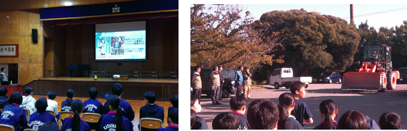 本校CS会長の小川建設小川さんや同じくCS委員の北浜土木清田さんのご協力もあり、加賀市建設業協会の方々にる建設業の仕事の講演会を開きました。これまた塩浦建設の塩浦さんのプレゼンでの説明は、建設業の仕事内容から地域貢献、地元片山津での施工事例など多岐にわたり興味深いものでした。さらに、ロードローラーやユンボ等工作用重機の操作実演もありとても充実した学習の時間となりました。