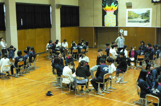 3年生家庭科「家庭生活」の学習には、「介護など高齢者との関わり方について理解すること」「高齢者など地域の人々と関わり,協働する方法について考え,工夫すること」があります。これを目指し、ぬくもりの里の職員の方12名にご協力いただきました。