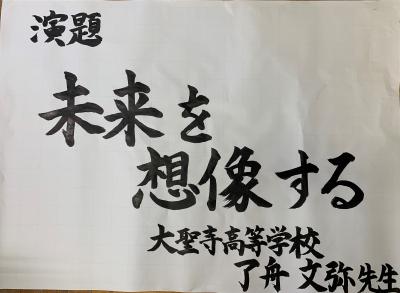 昨日の『夢先案内人』である了舟文弥先生の話は、とても良かったです。演題は『未来を想像する』でした。冒頭から一体どんな話が待っているんだろうと「わくわく」が満載のお話でした。彼が歩んできた人生の中で自らが実体験したことからのお話なので、最後まで生徒たちも聴き入っていました。あれだけ人を引き付ける魅力と話術を兼ね備えている人はそういません。これからも大聖寺高校の生徒は勿論、そして夢を持ち、夢を追いかける地域の中学生たちにお話をしていってほしいなぁと思いました。了舟文弥先生、貴重な時間を本校生徒たちのために頂き、そして講話を頂いて本当にありがとうございました。本校の『夢授業 第1弾』は、恙無く終了しました。