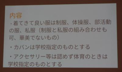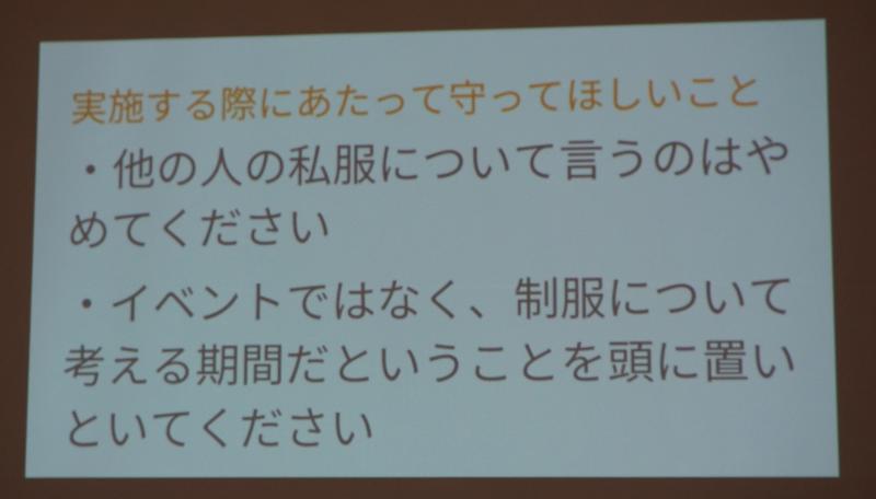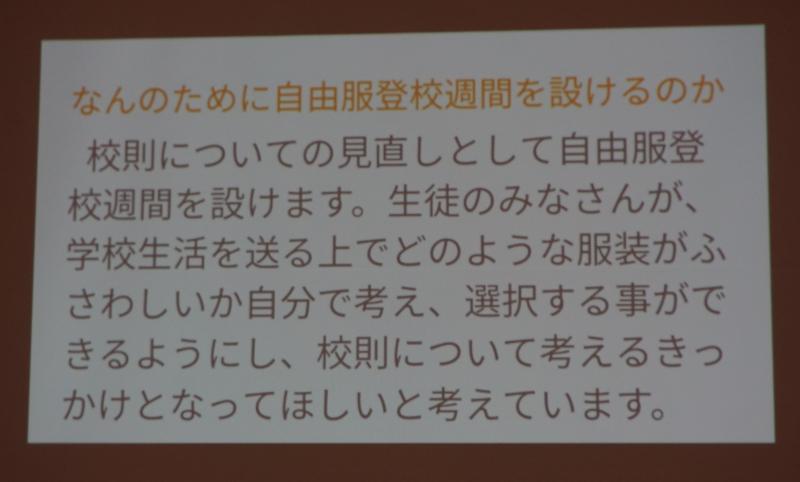 今、生徒会生活委員会では、校則の「見つめ直し」に取り組もうとしています。その第一弾として「制服」。生徒たちの意識はどうなんでしょうか。まずは生徒たちがどう考えているのか。ちょっと探ってくれているようです。