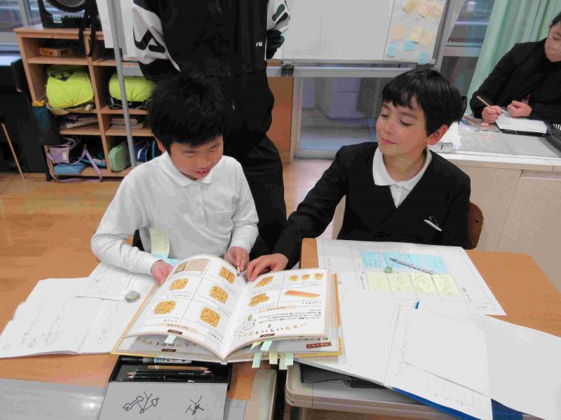 今日の授業では、ブックの「中」に書く内容を検討していました。本を活用したり、友だちとアドバイスし合ったりしながら、これ出お家の人におどろきやヒミツが伝わるのか一生けん命考えていました。