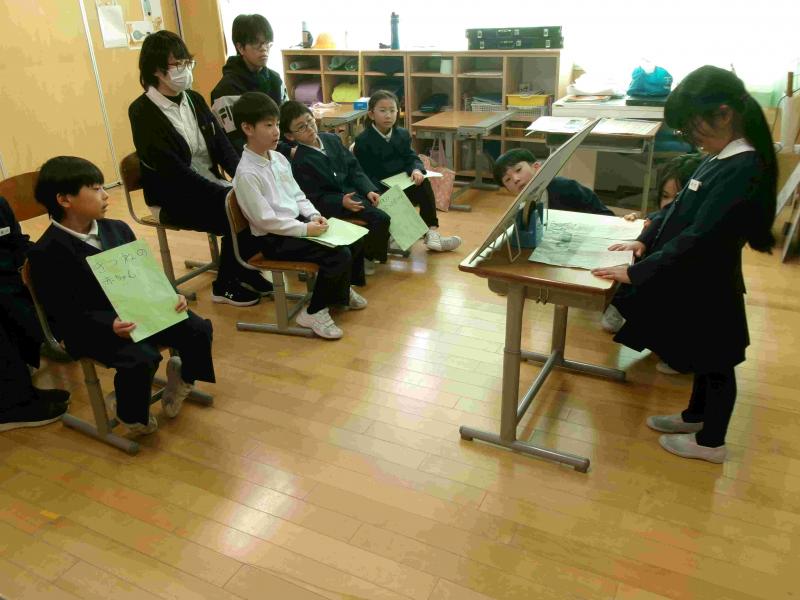 国語科の学習で、1年生は「どうぶつの赤ちゃん」、2年生は「ロボット」について調べたり、考えたりしたことを発表していました。友だちが調べたテーマについて、興味しんしんで聞いていました。