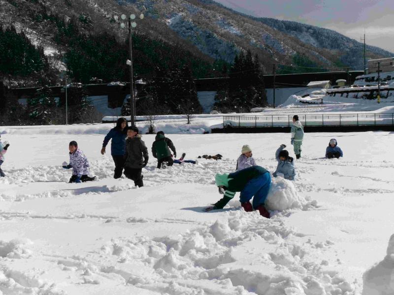 お天気がよい日で、昼休みは雪を楽しんでいました。低学年は下半身が埋もれてしまうのではないかと思うほど、運動場には雪が積もっています。