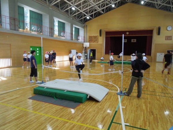 低学年の団体競技、「どきどきタイフーン」。くるくる上手にまわって、すばやくみんなで翔んで、バーをリレーしていきます。