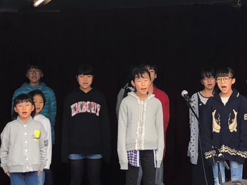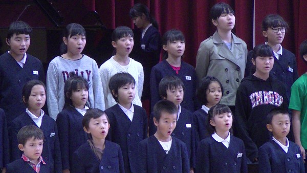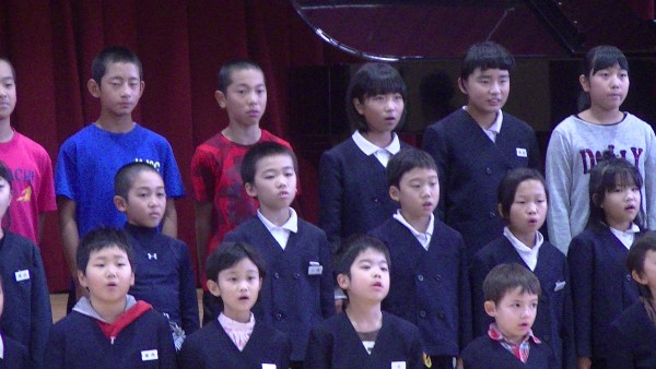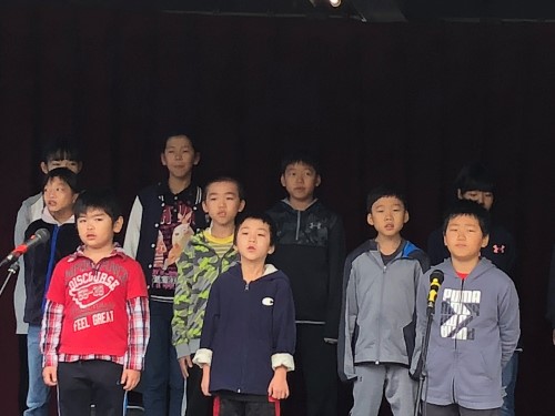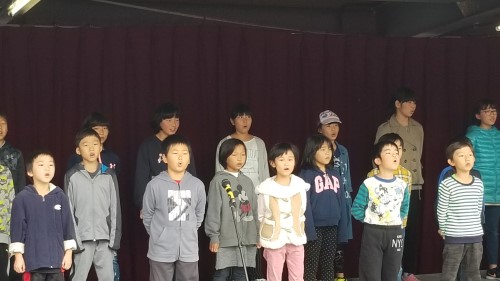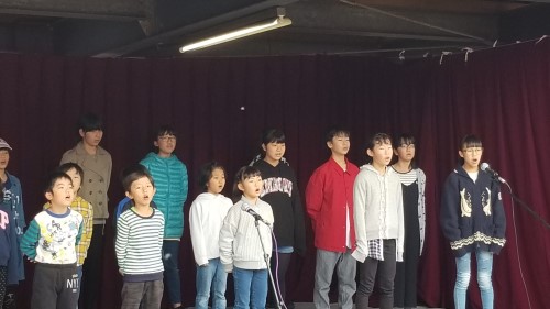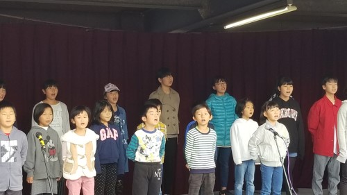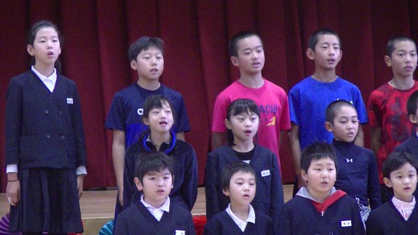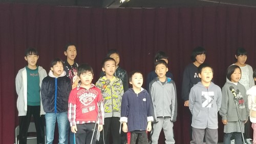 全校合唱。みんな朝なのに素晴らしいハーモニーを響かせていました。