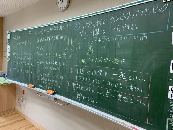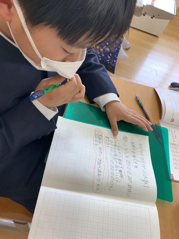 4年教室は算数の「大きな数」の授業中。10進法の整数のしくみ、小学校の総ざらいという単元ですね。小数の操作への発展を含めて、大切な学習の局面です。