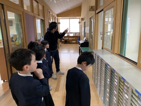 コンパクトな河内小の校舎ですが、1年生達はやがて始まる「そうじの時間」に自分はどこの教室を担当するか、教えてもらった場所まで担任を「連れていく」学習をしていました。