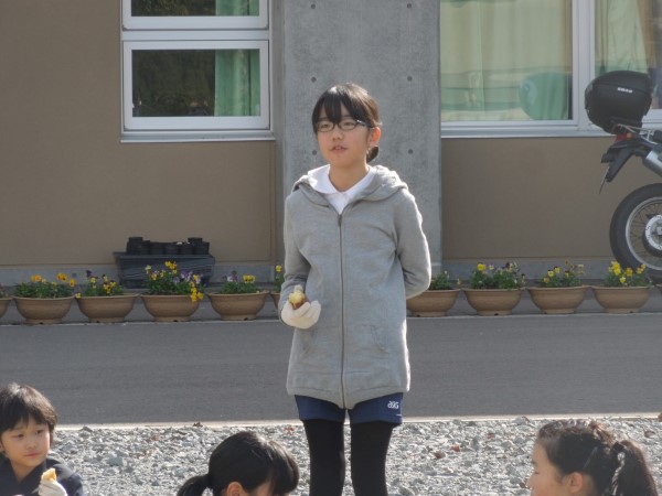 サツマイモをにぎりしめたまま、いっしょうけんめい感想を発表する1年生。かわいくて、けなげでした。