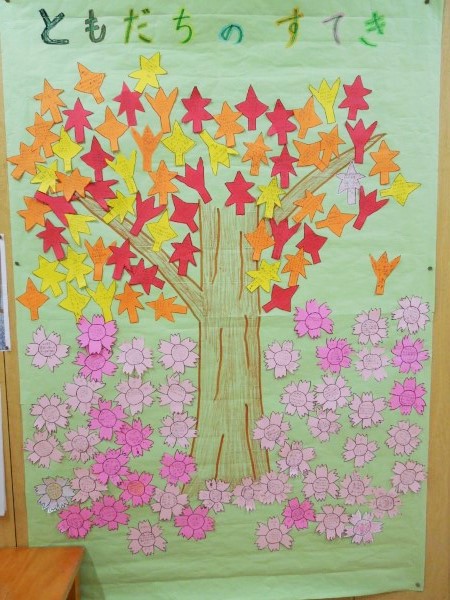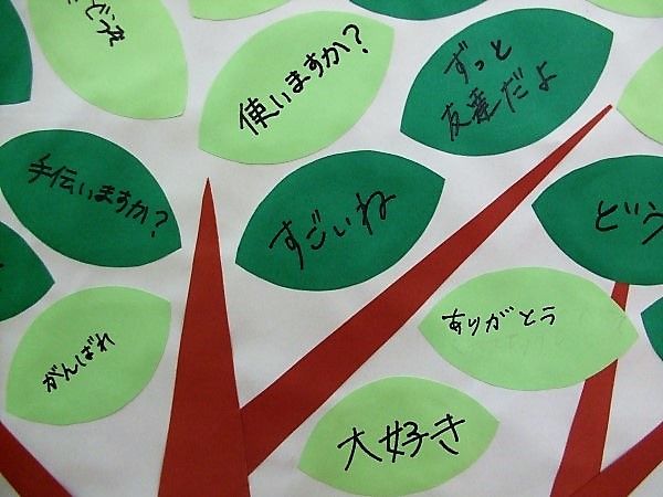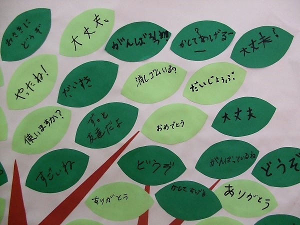 秋の様々な取り組みの中で、学年を越えていろいろな交流がありました。その中で、河内っ子たちがお互いに「ありがとう」の感謝の気持ちを伝えあうこと、それを「すてき(木)」に葉っぱとして貼り付けて、大きな木を完成させようという取り組みをしました。
