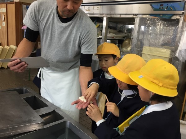お世話になったのは、学校にほど近い「地場産センター」です。見学のめあては「豆腐作り」です。