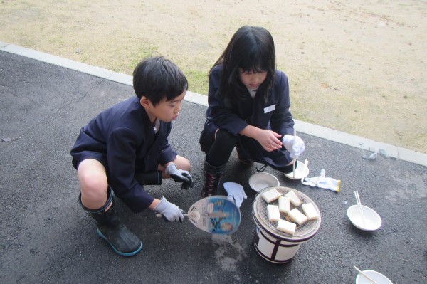 社会科「むかしの暮らし調べ」で、博物館見学をしたり、昔の道具調べをしたり、昔の人のくらしが便利な今の暮らしとのちがいを学習していますが、きょうは七輪を実際に使って、おもちやサツマイモなどを焼いてみようという楽しい体験活動です。
