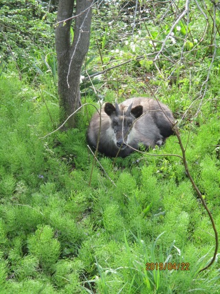 なんと、朝の通学時間帯に、河内小のそば、口直海の交差点近くの茂みに「カモシカ」が出現しました。実は昨日の資源回収のときにも来ていたのですが、2日連続の出現は珍しいです。