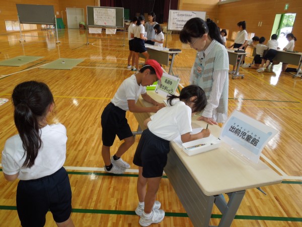 いそいで名簿に名前を書きます。