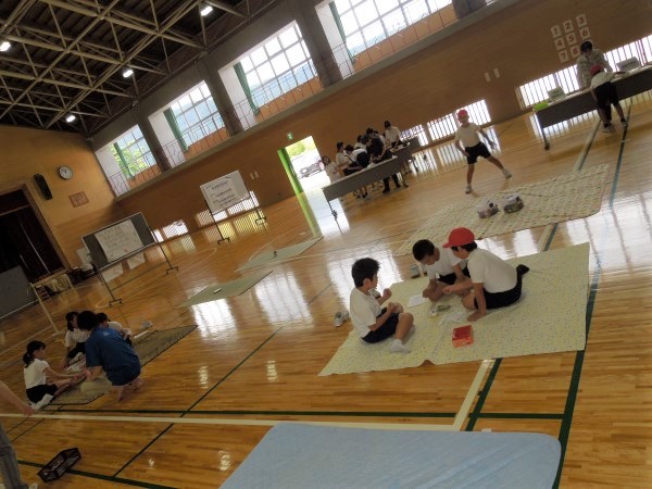 河内小学校の体育館の昼休み、いつもはドッチボールやバスケットボールで賑わっていますが、きょうはいつもとはちょっとちがう雰囲気です。やわらかなしきもの、テーブル、カラフルなグッズ・・・