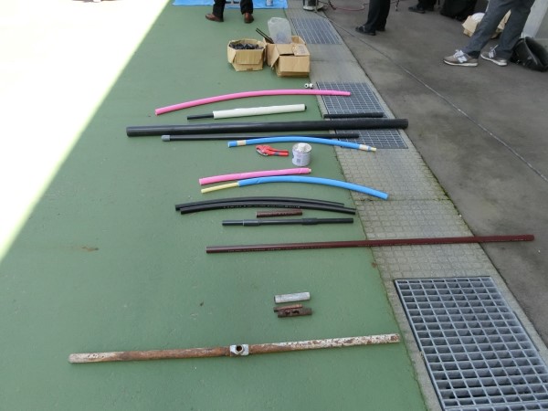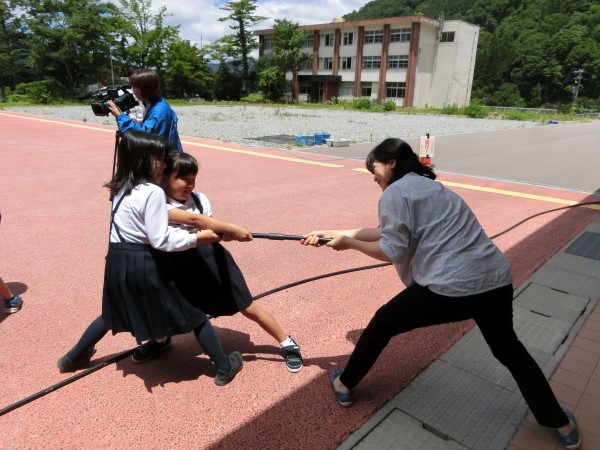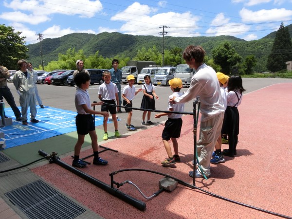 水道管の強さを実験中。ふじたせんせいと4年生ふたりが思い切り引っ張りますが・・・びくともしないね!