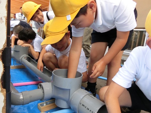 身近な「水道」を使う道具や設備を配置して、それらがどのようにつながっているかを体感できます。