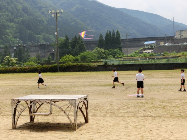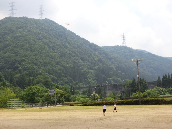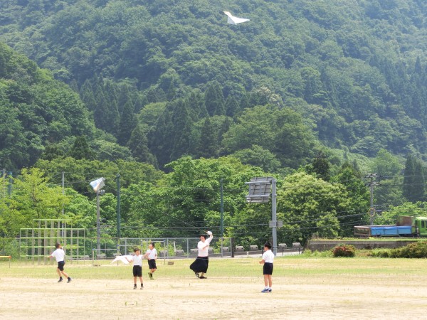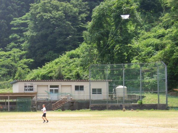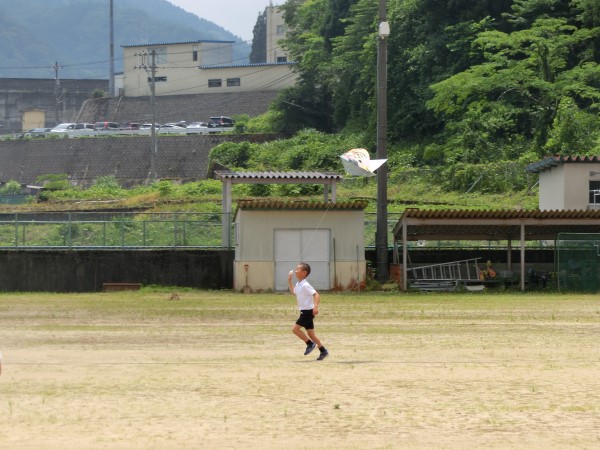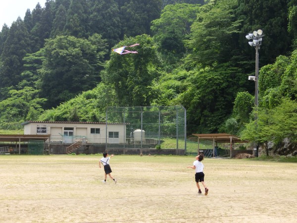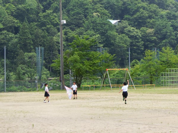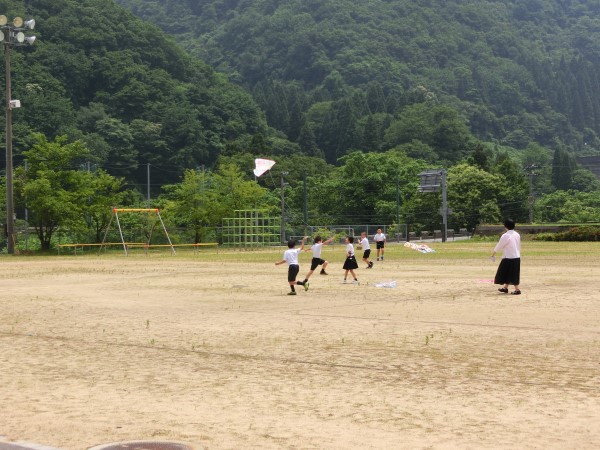 現代っ子はあまり「たこあげ」は経験がないようで、2年生達は自分たちで作ったたこが空高く上がっていくことに大興奮!!谷間にある河内小グランドを走り回っていました。