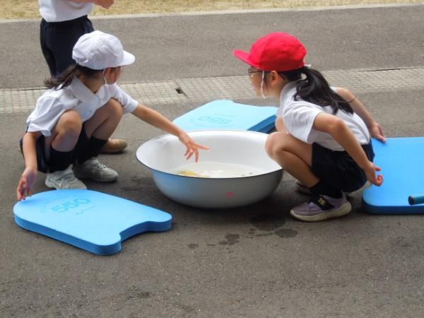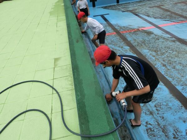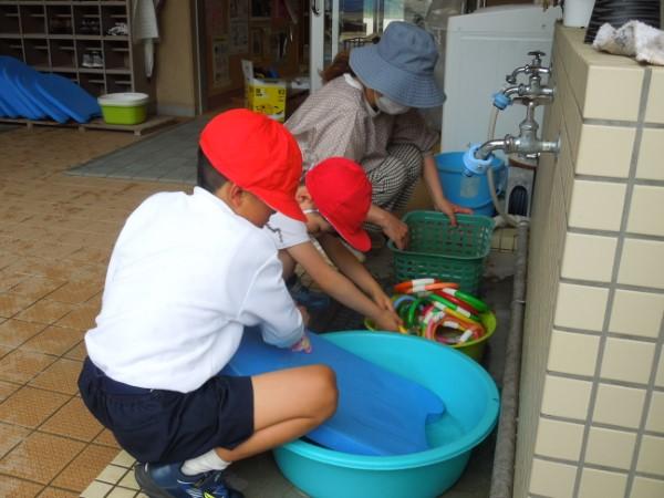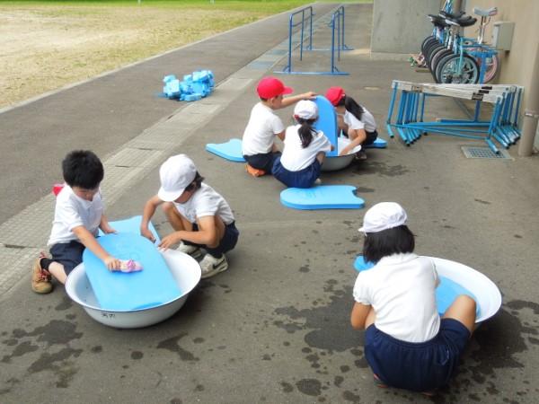 1・2年生たちはプールから運んできたビート板などの用具をきれいに水洗いをしてくれます。大きなたらいに水をくんで・・・