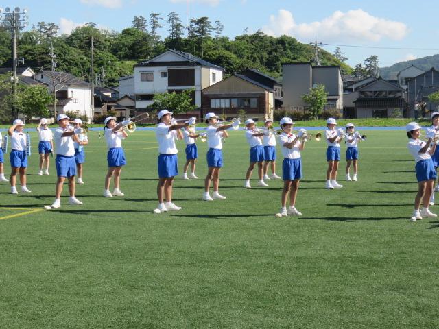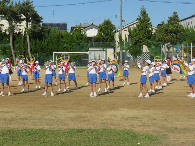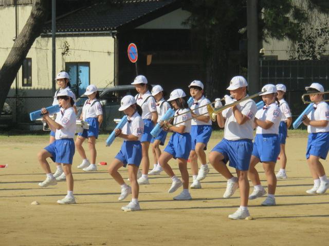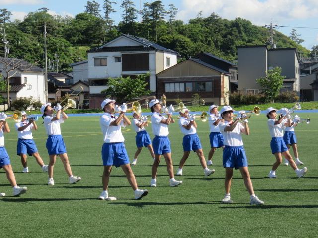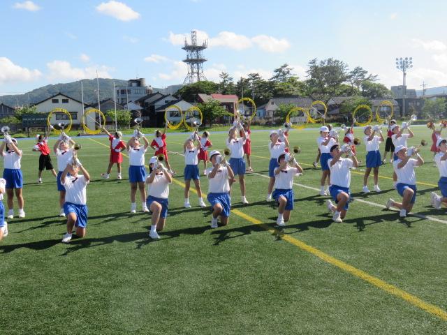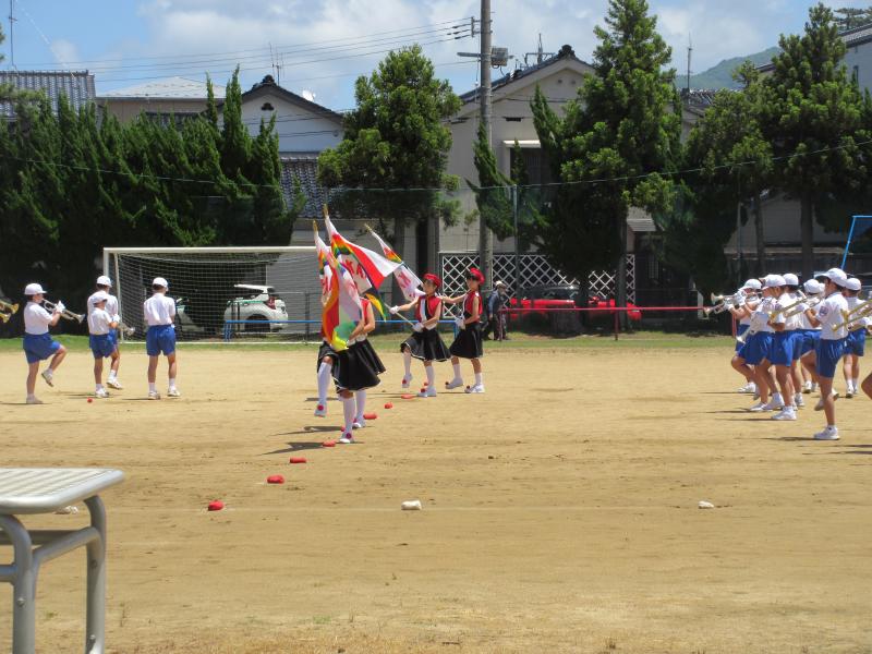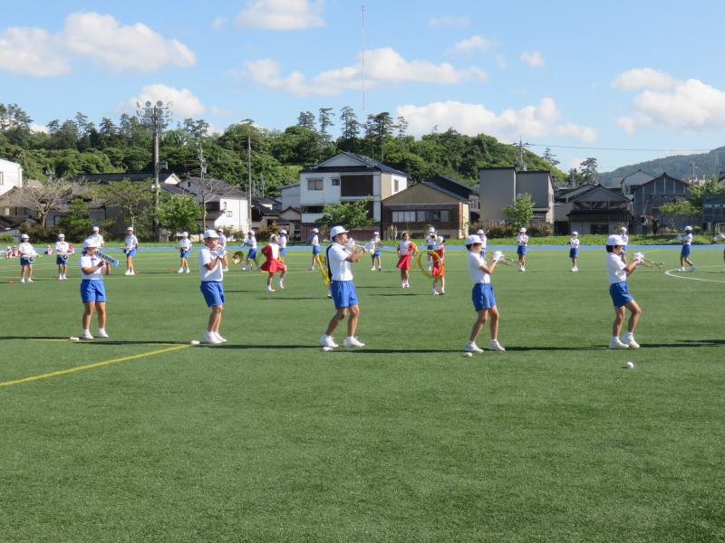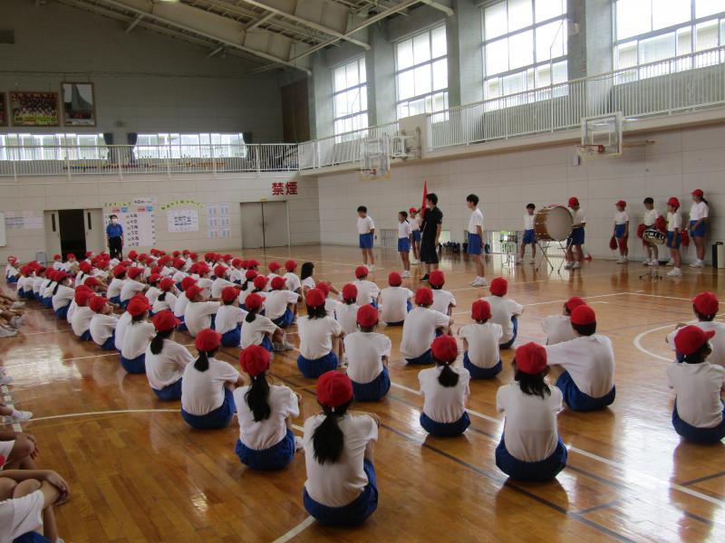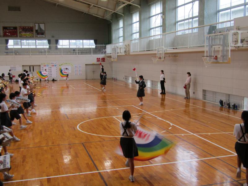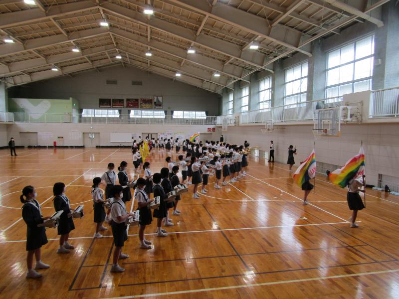 体育館で明日の1年生を向ける会に向けて金管鼓隊の練習がありました。