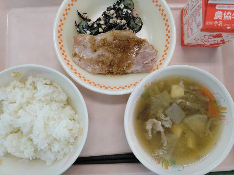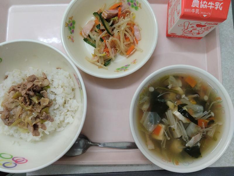*中学年の量です。肉のカットは指示しましたが、小間切れのため、豚丼のようになっています。
