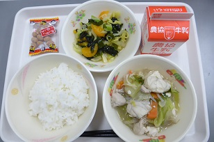 今日から一週間は学校給食週間です。今日は昭和の人気献立です。輪島市でも昭和59年に週3回の米飯給食が始まりました。わかめごはんは、人気献立でした。みそ汁、から揚も人気献立でした。