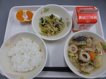 ごはん、たまごとじ、柿なます、みかん、牛乳