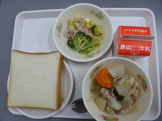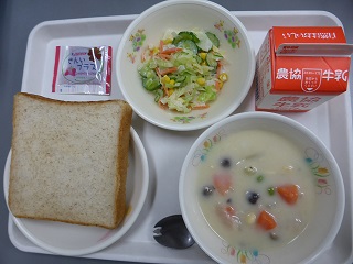 胚芽食パン、クリームシチュー、コールスローサラダ、いちごジャム、牛乳