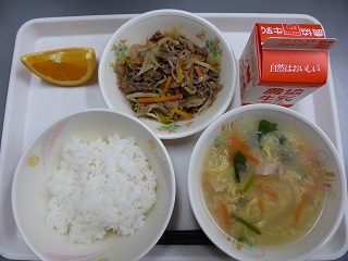 ごはん、しらたきのチャプチェ、たまごスープ、オレンジ、牛乳