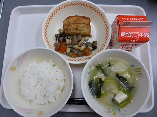 ごはん、サワラのいしる揚げ、五目豆、みそ汁、牛乳