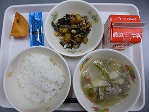 ごはん、豚汁、小魚揚げ煮、柿、のり佃煮、牛乳