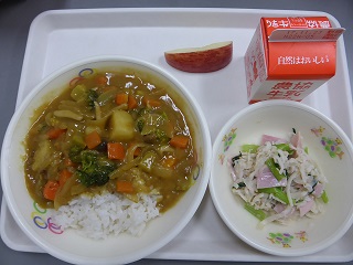 カレーライス、切干し大根サラダ、りんご、牛乳